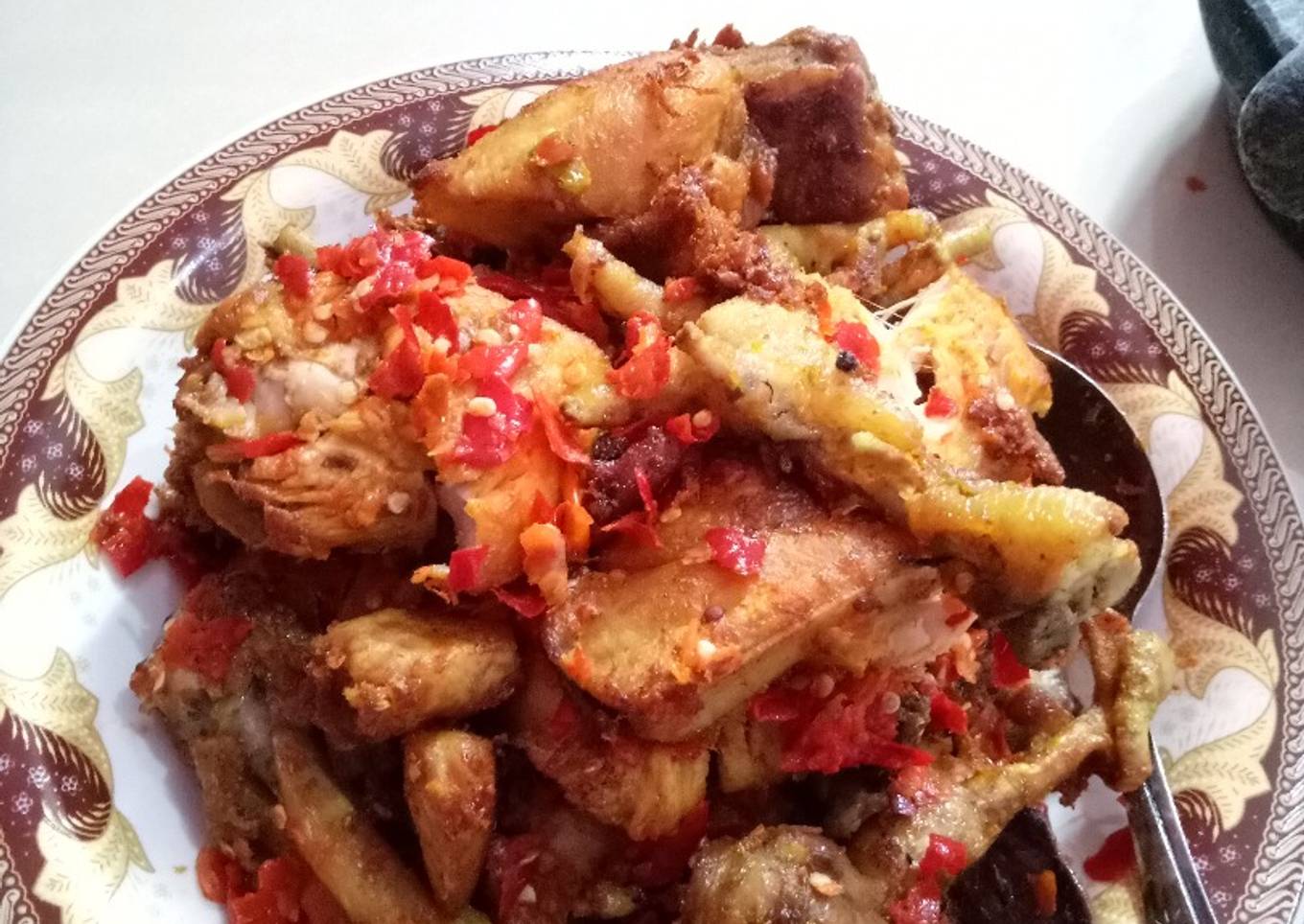 9. Geprek ayam yang sudah digoreng dan lumuri dengan sambal. Ayam Geprek siap disajikan :)