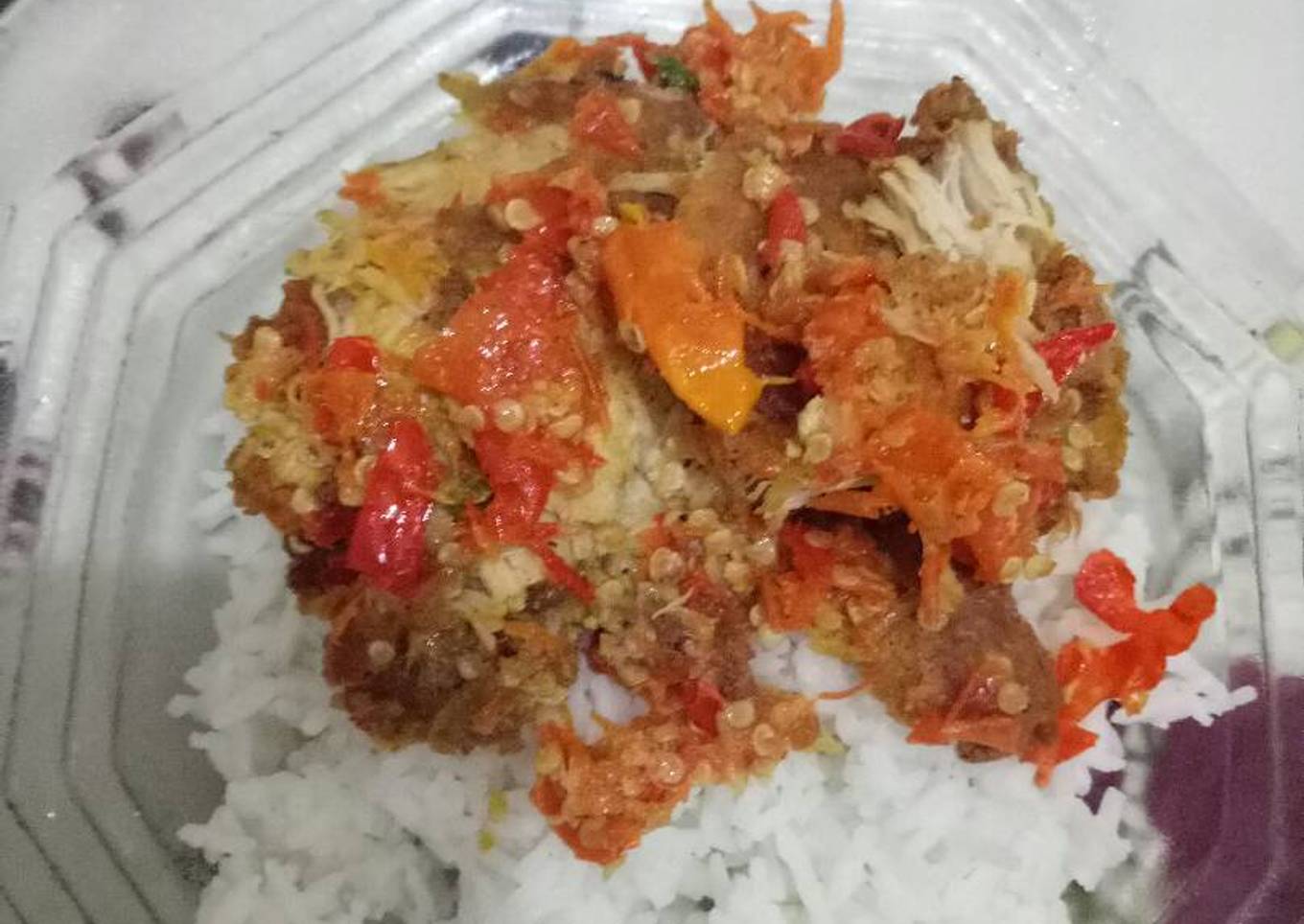 - Geprek ayam dengan cabe, garam, dan bawang putih yg sudah dihaluskan terlebih dahulu. Sajikan.