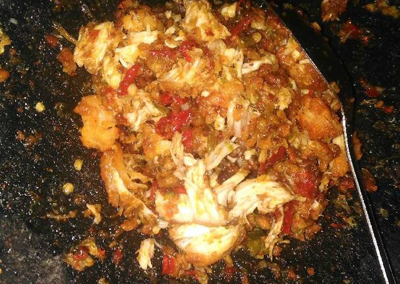 - Campur ayam yg sudah matang dengan sambal yg masih di cobek. Ulek lagi deh ayamnya sampe tercampur sama sambal.