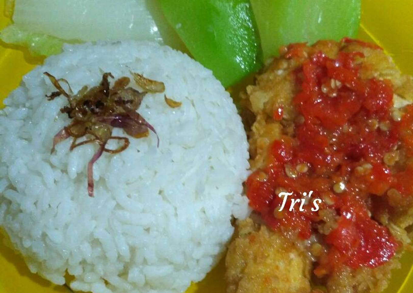 6. Ayam Geprek siap disantap dengan nasi panas\"\"